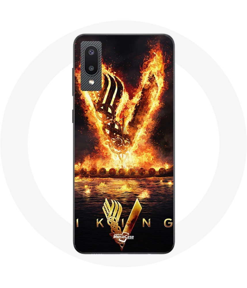 Coque pour Samsung Galaxy A02 Vikings Série Saison 6 logo V Epée de Feu Fond Noir