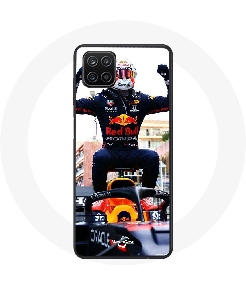 Coque Samsung Galaxy A12 Formule 1 Max Verstappen Pilote automobile F1 noir rouge et jaune